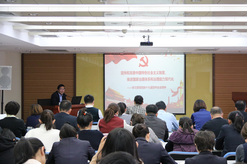 2019年11月28日,学习贯彻党的十九届四中全会精神宣讲报告会在A8体育免费看球举行。自治区党委宣讲团成员、宁夏社科院党组副书记、院长张廉做了宣讲报告。集团公司及各权属企业全体党员参加了报告会。