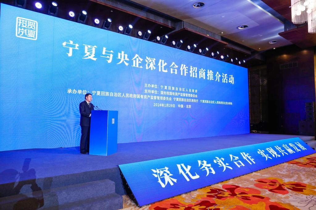 为接续精准发力,以“招大引强”助推全区经济高质量发展,通过推介会塑造投资宁夏招商品牌,1月29日上午,由自治区人民政府主办,自治区国资委、商务厅、驻北京办事处承办的,以“深化务实合作 实现共赢发展”为主题的宁夏与央企深化合作招商推介活动在北京举办。现场,全国48家央企110余位企业负责人在观看《宁夏——祖国西部的一块宝地》宣传片后,我区各部门、各地市及宁东能源化工基地管委会围绕营商环境、重大产业及拟合作领域重大项目等,在分别进行推介的同时,联袂向央企发出“邀请”。