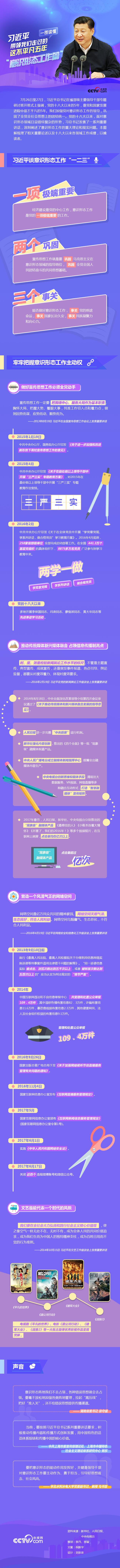 7月26日至27日,习近平在省部级主要领导干部专题研讨班开班式上强调,党的十八大以来的5年,是党和国家发展进程中很不平凡的5年。我们加强党对意识形态工作的领导,巩固了全党全社会思想上的团结统一。党的十八大以来,面对意识形态领域日益错综复杂的形势,习总书记发表了一系列重要讲话,深刻阐述了意识形态工作的重大理论和现实问题。本图解梳理了相关重要论述以及十八大以来各领域工作成绩,以飨读者。