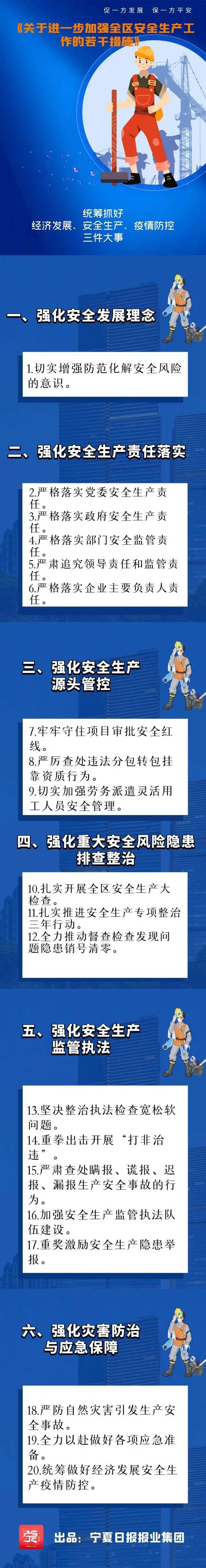 为进一步加强全区安全生产工作,消除安全风险隐患,有效防范遏制重特大生产安全事故发生,保持社会大局稳定,日前宁夏印发《关于进一步加强全区安全生产工作的若干措施》的通知(以下简称《通知》)。《通知》确定了二十项加强安全生产工作的硬措施,为统筹抓好我区经济发展、安全生产、疫情防控三件大事提供有效保障。