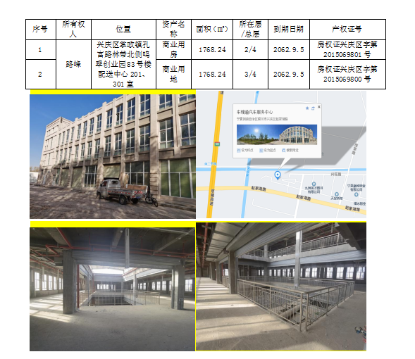 该抵押物为兴庆区掌政镇孔富路林带北侧鸣翠创业园83号楼配送中心201、301室,面积合计3536.48平方米。周边原计划建设物流园区,该抵押物为园区配套设施,目前处于空置状态。抵押物现已达到3通一平,外立面完整,内部未装修。可用于电商、仓储、办公等。该房屋1楼已出租用于简单的汽车修理和杂物仓库。