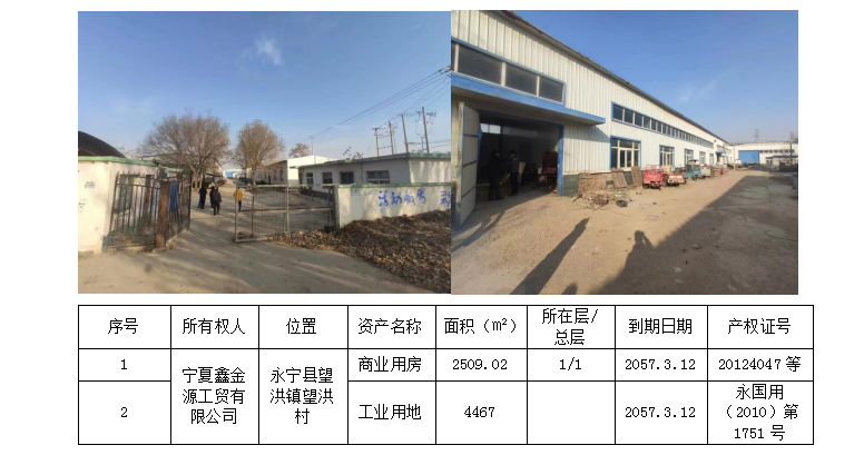 抵押物为宁夏鑫金源工贸公司名下位于永宁县望洪镇望洪村的工业用地和厂房,总建筑面积2509.02平米,占地面积4467平米,目前部分处于租赁状态,作为仓储使用。