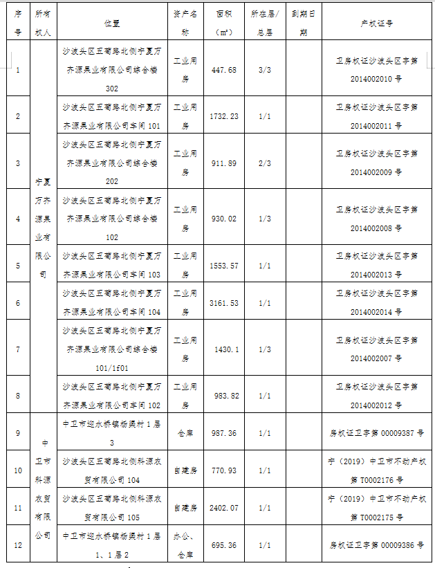 债务企业为中卫市明星企业,企业产业链完整,暂时因资金链断裂造成停产,债权抵押物位于沙波头区五葡路北侧,为新建办公楼、厂房及冷库,设施齐备。抵押物地处中卫市区边缘,交通便利,目前,部分厂房处于租赁状态,有较高的实用价值。