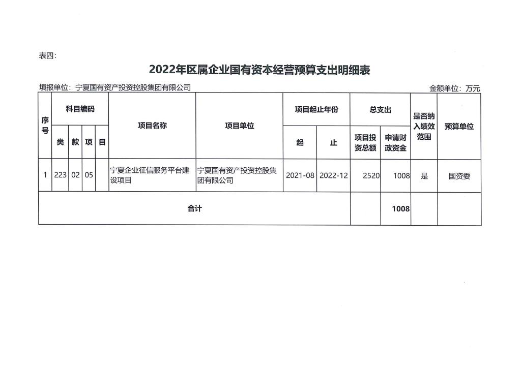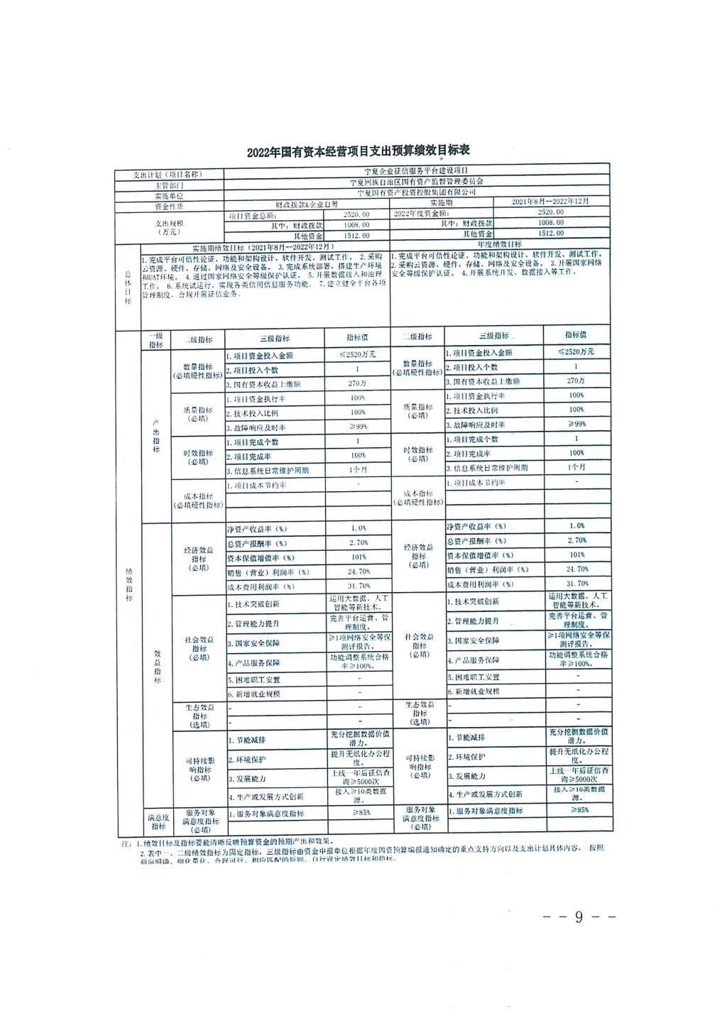按照《自治区国资委关于批复2022年国有资本经营预算和项目支出预算绩效目标的通知》(宁国资函〔2022〕3号)要求,A8体育直播国有资本支出项目为《宁夏企业征信服务平台建设项目》,项目总投资额2520万元,其中财政拨款1008万元。现将《2022年国有资本经营项目支出预算绩效目标表》予以公示。