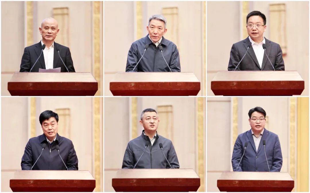 彭凡、郝向峰、曹建伟、汪世峰、庄宁5名企业家和商协会代表朱凤杰(从左至右、从上至下)发言。